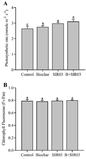 The results showed that the photosynthetic rate under the sole biochar treatment did not differ significantly from control plants (non-inoculated), whereas the treatment with the sole SIR03 strain caused a significant increase in photosynthetic rate, by 11.6% compared to control plants (non-inoculated). However, the combined application of SIR03 and biochar caused a significant increase in the photosynthetic rate by 14.4% compared to control plants (non-inoculated), but showed a non-significant difference compared to sole SIR03 inoculated plants (Figure 5A). In the case of chlorophyll fluorescence (Fv/Fm), no significant differences were found between the sole biochar, sole SIR03, and the combined application of SIR03 and biochar, compared to the control plants (non-inoculated) (Figure 5B).