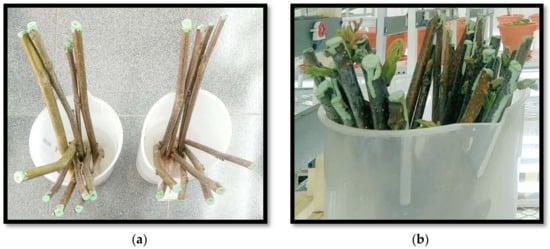 For obtaining forced explants, pruned stock bud wood was collected from experimental field stock plants of the Sulaiman variety of walnut during the dormant months of November-December. In order to force (Figure 1) the latent buds in the dormant wood (sub terminal or terminal potion, 15–20 cm long and 10–15 mm in diameter) were taken from bearing walnut trees. The dormant wood was first treated with Captan (@ 0.2 per cent), followed by cold storage at 4 ± 3 °C in poly-bags till further use. Forcing was done as per the procedure elucidated by [32].