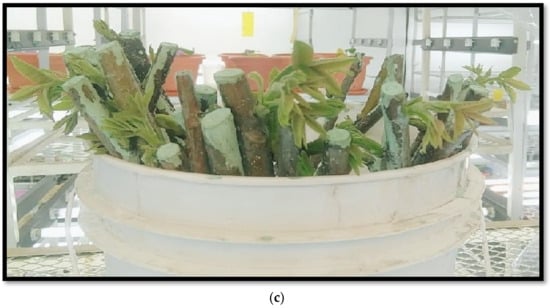 Various stages of forcing of dormant walnut cuttings in the growth chamber: (a) 0 day after incubation; (b) 10 days after incubation; (c) Complete leafing out after 20 days of incubation.