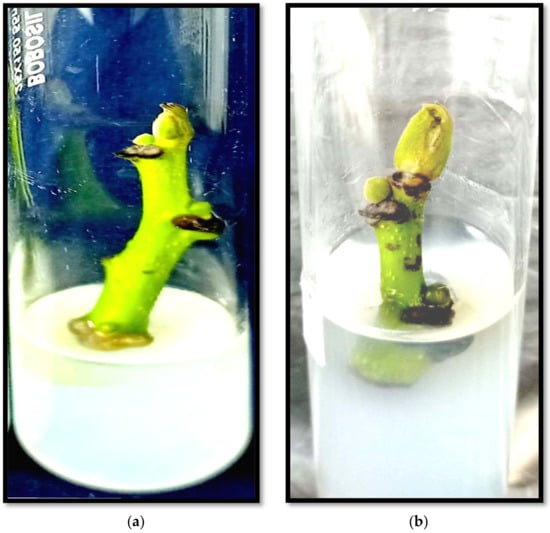 Survival of unforced and forced explants of walnut after anti-browning treatment: (a) Unforced shoot tip in DKW medium; (b) Forced shoot tip in DKW medium.