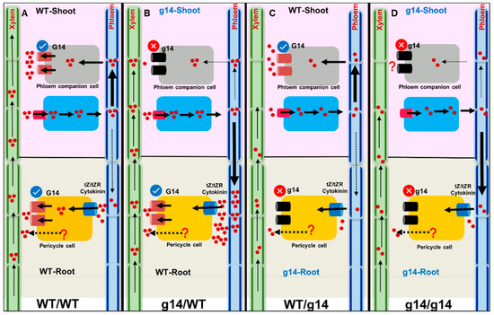 Furthermore, the movement of root-synthesized cytokinins to the shoot was tracked by feeding the root with 14C-labeled tZ and 2H-labeled tZ. The transport of 14C-tZ or 2H5-tZ to the shoot was suppressed in atabcg14/atabcg14, fully rescued in atabcg14/WT, and partially rescued in WT/atabcg14. Root AtABCG14 restored shootward tZ transport in atabcg14/WT; however, cytokinin signaling and growth were hampered. Additionally, tZ expression spread from the petiole–midrib to the lamina in WT/WT. In contrast, in atabcg14/WT, its expression was primarily observed in the petiole–midrib, indicating impaired cytokinin distribution from the veins to the lamina of atabcg14/WT. Further, cytokinins’ presence was high in the apoplast of WT/WT and WT/atabcg14 and low in atabcg14/atabcg14 and atabcg14/WT. However, the phloem sap of atabcg14/WT retained much higher tZ-type compared to others. Thus, root-synthesized cytokinin reached the shoot, but aerial-tissue disruption of AtABCG14 disturbed phloem unloading and translocation to the lamina (Figure 1). Hence, AtABCG14 plays a pivotal role in shoot cytokinin distribution. The authors proved that under dysfunctional shoot AtABCG14 expression in atabcg14/WT, cytokinin is not distributed in the leaves and is in retrograde from shoot to root. This finding validates that AtABCG14 expression in PCCs is associated with root-synthesized cytokinin efflux phloem unloading to the apoplast.