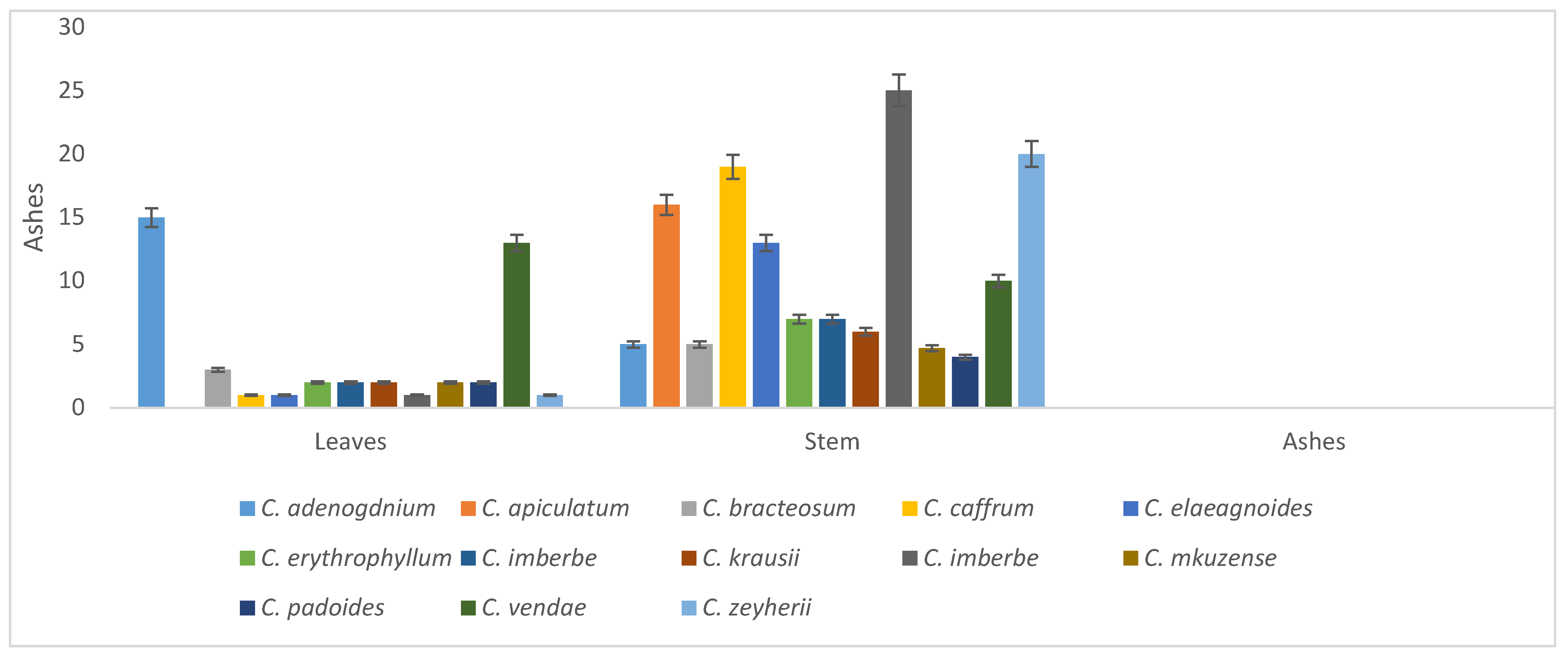 Mathipa, M.M.; Mphosi, M.S.; Masoko, P. Phytochemical Profile, Antioxidant Potential, Proximate and Trace Elements Composition of Leaves, Stems and Ashes from 12 Combretum spp. Used as Food Additives. Int. J. Plant Biol. 2022, 13, 561-578. https://doi.org/10.3390/ijpb13040045
