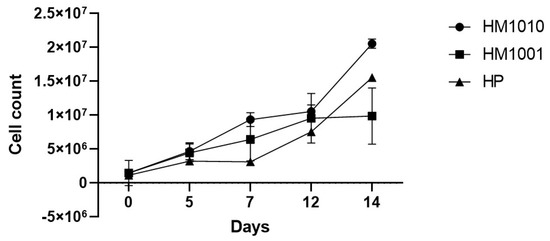 H. pluvialis cells were subjected to a random mutagenesis process through the application of UV rays in a system of glass microcapillaries to obtain better-performing genotypes. An amount (100 µL) of H. pluvialis was put into 1 mL serological pipettes and left under UV light for 15 min. After that, the microalgae were seeded into a petri dish containing self-produced media and let grow for 14 days. Different colonies were selected and transferred into liquid media, but only two strains with the best biometric parameters were selected for further analysis (HM1001 and HM1010). Mutant strain growth was followed as described in Section 2.1.