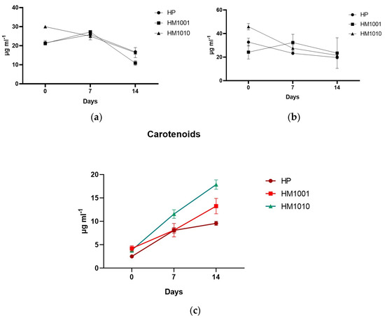 The preliminary results of the spectrophotometric analysis aimed at reevaluating the trend of the carotenoid pathway and, indirectly, of astaxanthin show an increased production in all cultures in response to saline stress. Figure 3c shows that, on day fourteen, all strains produced quantities of astaxanthin higher than on day 0; however, the HM1010 mutant reached the highest values (17.855 ± 0.998) compared to the WT (9.568 ± 0.432). On the other hand, the chlorophylls showed different trends between all the strains, but all of them decreased their production, entering the cells in a cystic phase and slowing down their metabolism.