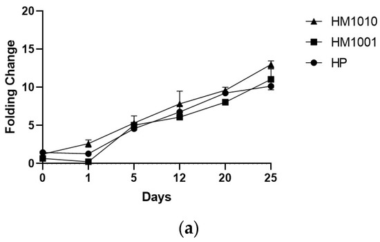 Following the UV-induced random mutagenesis, the growth of the WT genotype and the mutant strains was simultaneously followed to evaluate the adaptive differences in the growth medium. Figure 1 shows how the two mutant strains and the WT grew differently in the self-cultured medium. In particular, the mutant strain HM1001 on day 12 reached a plateau phase, while the mutant strain HM1010 on day 14 was still growing.