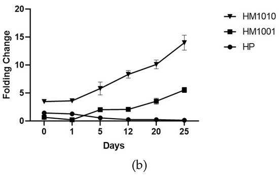 The genetic analysis of bkt expression confirmed the spectrophotometric data, as all strains showed an increase in gene expression of bkt—HM1010, more than the others (Figure 4a). To normalize the gene expression, we used unstressed cell cultures; however, the results obtained were interesting, as we found that the HM1010 mutant showed high levels of bkt expression even in the green phase (Figure 4b). The analysis of variance (ANOVA) shown p < 0.01 between the three groups and p = 0.004 between each point in the analysis.