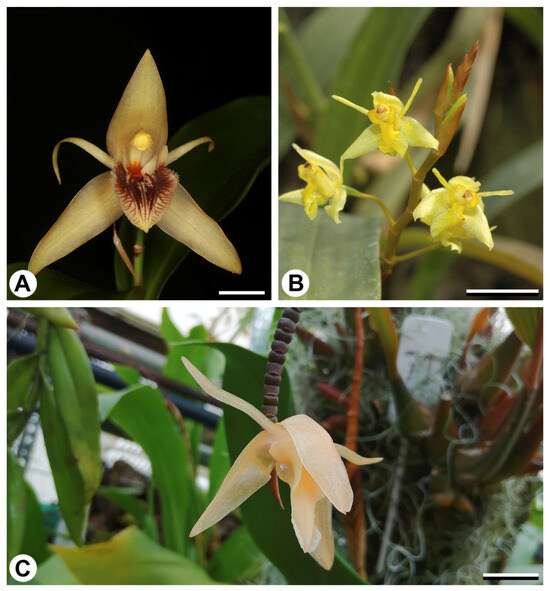 Flowers of Coelogyne species: (A) C. ovalis; (B) C. prolifera; (C) C. monilirachis. Scale bars: (A,C) = 1.5 cm; (B) = 1 cm.