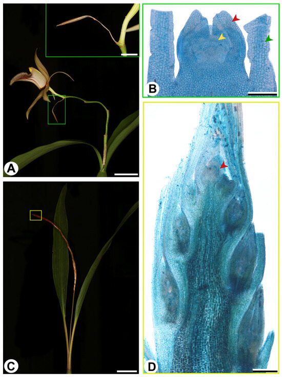 Inflorescences of C. ovalis and C. prolifera. (A) One-season inflorescence and flower of C. ovalis, green inset—last undeveloped bud with rudiment of apical flower; (B) rudimentary apical flower of C. ovalis, red arrow—rudiments of sepals, yellow arrow—rudiment of gynostemium, green arrow—bract; (C) inflorescence of C. prolifera with two intercalary clusters; (D) structure of the apical floral zone of C. prolifera with flower primordia in the axils of bracts; red arrow, apical meristem. Scale bars: (A) = 2 cm (green inset = 0.5 cm); (C) = 1.5 cm; (B,D) = 0.6 mm.
