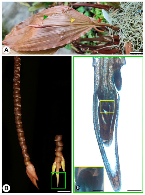 Inflorescence of C. monilirachis. (A) Stage of formation of the first floral unit, red arrow—stem section of the inflorescence (peduncle), yellow arrow—elongated first floral unit of the rachis, green arrow—resupinate apical flower of the first floral unit; (B) distal part of the rachis of a 5-year-old generative shoot; inset: morphological structure of the inflorescence tip without bracts and with non-resupinated flower buds; (C) longitudinal section of the inflorescence apex; inset—spherical meristem of apical flowers of two successive axes. Scale bars: (A) = 1 cm; (B) = 1 cm; (C) = 1 mm (inset = 0.2 mm).