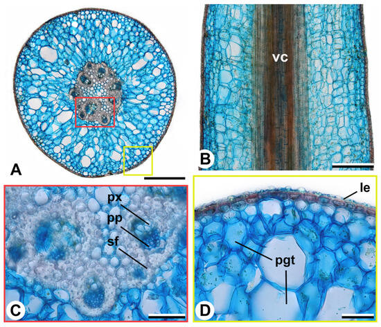 Anatomical structure of the first floral unit of the rachis of C. monilirachis. (A) Cross section; (B) longitudinal section; (C) closed collateral vascular bundles; (D) cross section of the peripheral zone with hypertrophied parenchyma cells. Abbreviations: px, primary xylem; pp, primary phloem; sf, sclerenchyma fiber; pgt, parenchymatous ground tissue; le, lignified epidermis; vc, vascular cylinder. Scale bars: (A,B) = 0.25 cm; (C) = 0.05 mm; (D) = 0.04 mm.