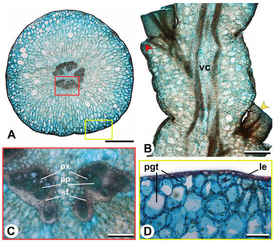 Anatomical structure of the thickened internode of the rachis of C. monilirachis. (A) Cross section; (B) longitudinal section with removed bracts and rudimentary flowers, red arrow—place of attachment of the removed bract, yellow arrow—base of the ovary of the removed flower; (C) closed collateral vascular bundles; (D) cross section of the peripheral zone with hypertrophied parenchyma cells. Abbreviations: px, primary xylem; pp, primary phloem; sf, sclerenchyma fiber; pgt, parenchymatous ground tissue; le, lignified epidermis; vc, vascular cylinder. Scale bars: (A,B) = 1 cm; (C) = 0.2 mm; (D) = 0.1 mm.