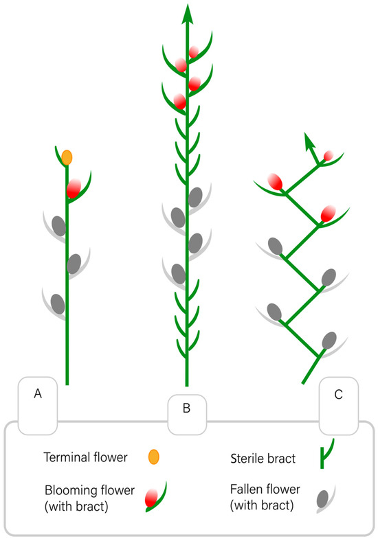 The distinction between inflorescences and the arrangement of flowers remains a subject of debate in the scientific community. Previously, the definition of “inflorescence” in classical morphology included its single-season continuous growth and dying off after flowering and fruiting [1,2]. This definition was suitable for flowering plants in seasonal climates but did not encompass the full range of inflorescences found in tropical and subtropical plants, including orchids with both single-season and perennial (intercalary) inflorescences [3,4].