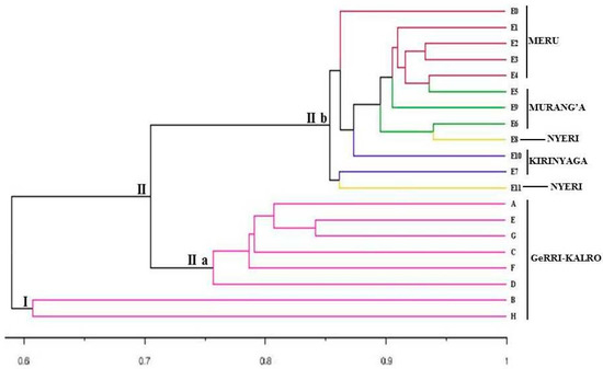Based on Jaccard’s (J) similarity coefficient and using the UPGMA method, the dendrogram (Figure 1) divided the 20 yam accessions into two major clusters (I and II) at a Jaccard’s similarity coefficient of 0.59. The two major clusters namely I and II composed of 2 and 18 yam accessions, respectively. Cluster I includes two accessions (B and H) from GeRRI–KALRO, while cluster II includes 18 accessions that were divided into sub-clusters, sub-cluster II(a) with 12 yam accessions and sub-cluster II(b) with 6 yam accessions. All the 12 yam accessions (E0, E1, E2, E3, E4, E5, E6, E7, E8, E9, E10, and E11) in sub-cluster II(b) were obtained from Meru, Kirinyaga, Murang’a, and Nyeri coun\ties (central and upper eastern regions in Kenya) while the 6 yam accessions (TDr2579, Makwaka, TDr2436, Amola, TDr00917, and Obiotungu) in sub-cluster II(a) were obtained from GeRRI–KALRO.