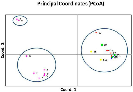 Polymorphism information content (PIC) per locus was computed using Power Marker (version 3.25). Principal coordinate analysis (PCoA) and analysis of molecular variance (AMOVA) were performed using GENALEX 6.5 software [32] (accessed on 12 September 2022). The distance matrices were generated based on Jaccard’s similarity coefficient. Similarity matrices were subjected to cluster analysis through the unweighted pair group method with arithmetic mean (UPGMA) and a dendrogram was constructed using FigTree software (Version 1.4.2; accessed on 12 October 2022).