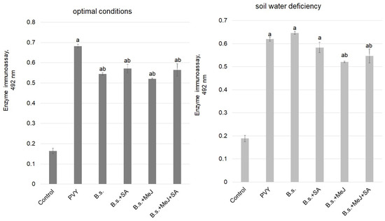 Detection of PVY by ELISA in the sap of potato leaves after application mixture of B. subtilis with SA and MeJ. Control—health plants; PVY—infected with PVY plants; B.s.—B. subtilis + PVY; B.s. + SA—B. subtilis + salicylic acid + PVY; B.s. + MeJ—B. subtilis + methyl jasmonate + PVY; B.s. + MeJ + SA—B. subtilis + salicylic acid + methyl jasmonate + PVY. a—indicates means that are statistically significantly different from the control, b—indicate means that are statistically significantly different from the PVY.