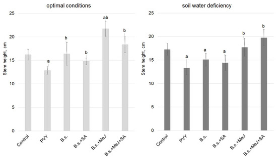 Effect of PVY infection and the mixture of B. subtilis with SA and MeJ application under soil water deficiency on potato stem height. Control—health plants; PVY—infected with PVY plants; B.s.—B. subtilis + PVY; B.s. + SA—B. subtilis + salicylic acid + PVY; B.s. + MeJ—B. subtilis + methyl jasmonate + PVY; B.s. + MeJ + SA—B. subtilis + salicylic acid + methyl jasmonate + PVY. a—indicates means that are statistically significantly different from the control, b—indicate means that are statistically significantly different from the PVY.