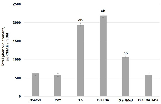 Effect of PVY infection and the mixture of B. subtilis with SA and MeJ application under soil water deficiency on total phenolic contents. Control—health plants; PVY—infected with PVY plants; B.s.—B. subtilis + PVY; B.s. + SA—B. subtilis + salicylic acid + PVY; B.s. + MeJ—B. subtilis + methyl jasmonate + PVY; B.s. + MeJ + SA—B. subtilis + salicylic acid + methyl jasmonate + PVY. a—indicates means that are statistically significantly different from the control, b—indicate means that are statistically significantly different from the PVY.