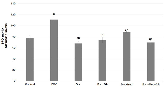 Effect of PVY infection and the mixture of B. subtilis with SA and MeJ application under soil water deficiency on PPO activity. Control—health plants; PVY—infected with PVY plants; B.s.—B. subtilis + PVY; B.s. + SA—B. subtilis + salicylic acid + PVY; B.s. + MeJ—B. subtilis + methyl jasmonate + PVY; B.s. + MeJ + SA—B. subtilis + salicylic acid + methyl jasmonate + PVY. a—indicates means that are statistically significantly different from the control, b—indicate means that are statistically significantly different from the PVY.