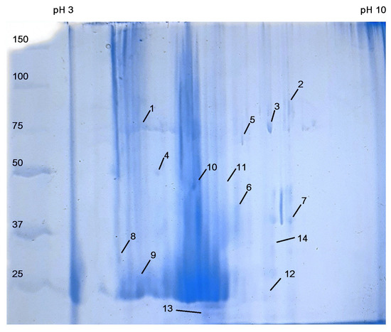 Isoelectric focusing of proteins was performed on a Protean IEF system (Biorad, Hercules, CA, USA). To separate proteins by the isoelectric point, we used ready-made 7-cm strips (Biorad, USA), pH range 3–10. Before focusing, passive rehydration was performed for 12 h at 20 °C. Focusing was carried out at a voltage of 4000 V (20,000 V h) for 22 h, then the voltage was maintained at 500 V until the end of the process. After isoelectric focusing, the strips were kept for 15 min successively in solutions of 2% dithiothreitol and 2.5% iodoacetamide in buffer solutions with 25% glycerol, then washed in 0.025 M Tris-glycine buffer, pH 8.3.