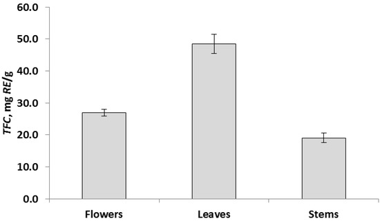 Total flavonoid content, TFC, expressed as mean ± SD (in error bar).
