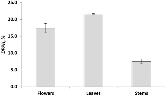 The total phenolic content (TPC) was determined by reaction with the Folin–Ciocalteu reagent [8]. The extracts were preliminarily diluted 100 times. Then, the optical density was measured at a wavelength of 765 nm. Calibration was carried out using gallic acid in the concentration range of 10–200 µg/mL; calibration equation: y = 4.630x + 45.505 (R2 = 0.9979). The total content of phenolic components was expressed in mg of gallic acid equivalent (GAE) per gram of plant material.