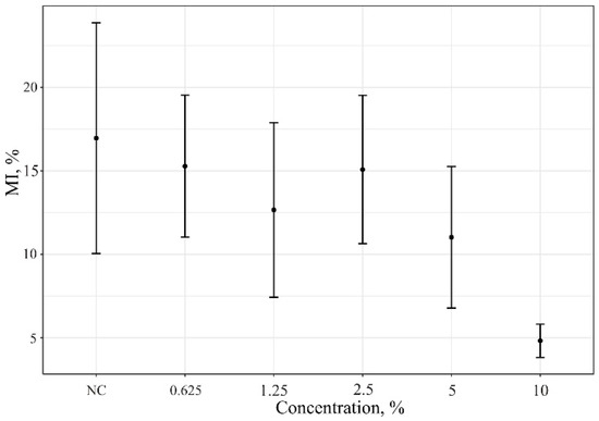 R. acris flower extract had a concentration-dependent mitodepressive effect on A. cepa root meristem cell division (Figure 6).