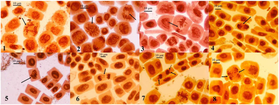 Chromosomal aberrations and other disturbances in mitosis of A. cepa root meristem cells after treatment with of R. acris flower extract. (1) Disruption of spindle in metaphase; (2) multipolar mitosis and bridge in anaphase; (3) disturbance in metaphase; (4) stickiness of chromosomes in anaphase; (5) stickiness of chromosomes in metaphase; (6) fragments of chromosomes in telophase; (7) lagging chromosomes and the appearance of nuclear buds in telophase; (8) disruption of spindle in anaphase. Staining with acetoorcein, ×400 magnification.