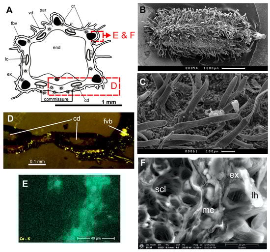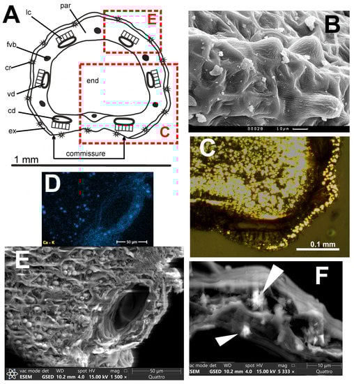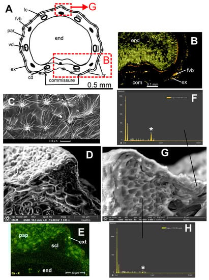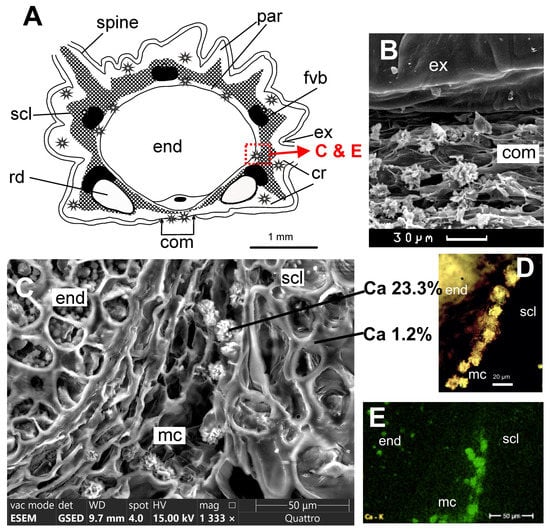 Figure 3E shows that calcium was determined in the short papillae of the exocarp, although the crystals are located under the cell wall.