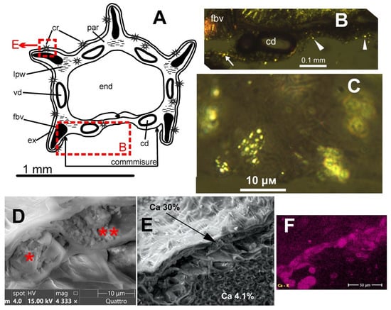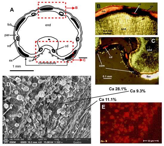 ESEM and EDS: Nine maps and 14 spectra were studied. Small (3–5 µm) druses of crystals and irregularly shaped bodies 1–2 µm in size are located in the exocarp and mesocarp. In the endosperm, some cells are completely filled with calcium compounds up to 12 microns in size. The crystals are composed of carbon, oxygen, and calcium. The content of calcium on the elemental maps of the fruit transverse section was from 2.1% to 4.7%, and in the thick layer of non-cellular substance on the commissure from 13.3% to 15.9%. In the spectra of the elements, calcium content on the crystals was shown from 9.6% to 29.8%, in the sclerenchyma 4.9 to 7.7%, and in the parenchyma without obvious crystals, the calcium content was 5.4%.