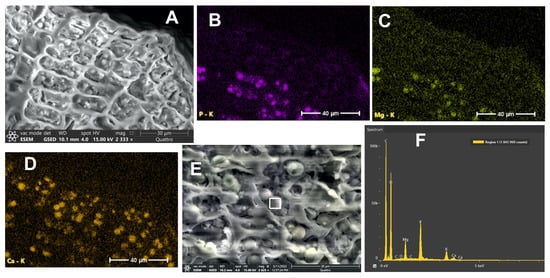 ESEM and EDS. Eight maps and eight spectra were studied. On the elemental maps, calcium accumulations are shown in the exocarp, and parenchyma of the mesocarp; in the sclerenchyma of the vascular bundle, calcium inclusions were not detected. There is little calcium in the endosperm, it is noticeable in cells where spherical bodies with phosphorus and magnesium are not visible. Accumulations of calcium (3–10 μm in size) in the exocarp and mesocarp can fill almost the entire cell cavity, they are composed of carbon, oxygen, and calcium; the calcium content being from 15.4 to 19.6%. In the sclerenchyma of the vascular bundle, 4.2% calcium was determined, and in the top of the hair 3.9%.