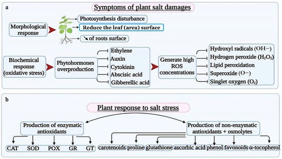 Plant salt stress repercussions and mechanisms of salt alleviation. (a) symptoms of plant salt damage. (b) plant responses to salt stress.