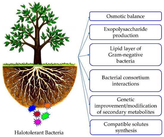 Apart from the plant and bacteria’s separate mechanisms of salt adaptation, plants could improve their salt stress tolerance through symbiotic associations with rhizospheric and endophytic bacterial communities [23,27,37]. Soil salinity affects rhizosphere communities and creates a natural selection pressure that is positive for halotolerant bacteria [39]. Soil salinity affects rhizospheric communities and creates a positive selection of halotolerant bacteria. This specific group has a significant role in improving both soil and plant health [80].