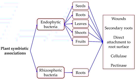 The rhizosphere is the primary source of endophytes [27], where competitive bacteria are attracted by plant exudates engaging only powerful and beneficial bacteria [39,81]. Bacterial entrance into the host plant occurs either by the secretion of specific enzymes such as cellulase and pectinase which allows them to break down the root cortex [28], or by wounds existing naturally during the propagation of secondary roots and/or caused by phytopathogens [82]. The most common definition of endophytic bacteria includes all those that, during part or all of their life cycle, invade the internal tissues of plants (leaves, flowers, seeds, stems, and roots) without causing disease and that can confer benefits to their host [83]. For a more detailed definition and history of endophytes, I invite you to read the book chapter in Slama et al. [30]. Shastry et al. [84] reported that the endophytic Enterobacter cloacae gene Ghats I encodes pectinesterases and cellulases enzymes having a crucial role in bacterial entry inside the host plant’s tissues [84].
