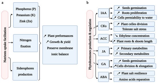 Bacterial mechanisms of salt stress tolerance. (a) nutrient uptake facilitation. (b) phytohormone production and regulation. Upward and downward arrows mean increase and decrease of options.