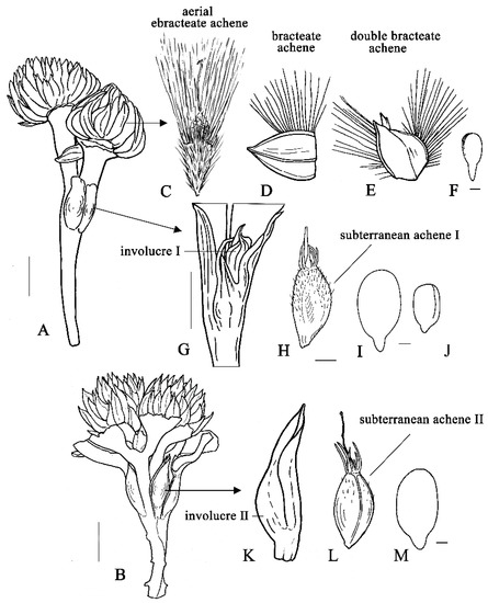 Among the subterranean fruits, we distinguish between two types of achenes: (a) subterranean achenes I (Figure 1H), which are poorly pubescent with undeveloped pappus, enveloped in a woody colorless involucre attached to the stem. They are usually present on plants and located in the subterranean fruiting heads, in the leaf axils (Figure 1G). (b) Presumably subterranean achenes II (Figure 1L) that are enclosed in non-sessile bud-like coriaceous dark brown involucre (Figure 1K). They develop from one-flowered partial heads in the branching locations, a few mm below the multi-flowered aerial heads or further down. To clarify the question of their aboveground or underground position, additional observations in nature are required.
