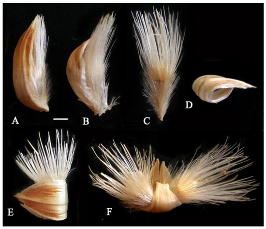Diversity of aerial fruits in G. micrantha, light microscopy. (A,B) Achenes with closed pappus, provided with subtending bract. (C) Ebracteate achene with opened pappus. (D) Receptacular bract twisted after re-drying. (E) Bracteate achene. (F) Double bracteate achene. Scale bars = 1 mm.