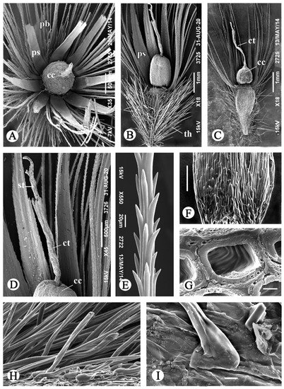 SEM images of aerial achenes and their structure in G. micrantha. (A) Achene with opened pappus, view from above. (B,C) Achenes with different sizes of the corolla cupula; the pappus elements and twin hairs partially deleted. (D) Apical achene part. (E) Fragment of pappus bristle. (F) Adaxial side of pappus scale. (G) Transverse section of the epidermal cell on the adaxial side of pappus scale. (H) Twin hairs of the pericarp. (I) Thickened base of twin hair. Abbreviations: cc, corolla cupula; ct, corolla tube; pb, pappus bristle; ps, pappus scale; st, style; th, twin hair. Scale bars: 1000 µm for (B,C); 500 µm for (A,D); 100 µm for (F); 50 µm for (H); 20 µm for (E); 10 µm for (I); 2 µm for (G).