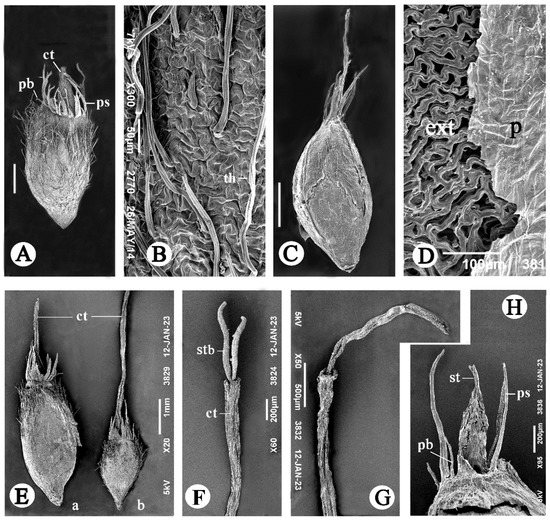 SEM images of subterranean achenes in G. micrantha. (A,B) Subterranean achene I and its surface, correspondingly. (C,D) Subterranean achene II and its surface, correspondingly. (E) Large (a) and small (b) subterranean achenes I from same two-seeded partial fruiting head. (F,G) Distal part of corolla tube with a protruding style in large and small achenes from Figure 4E(a) and Figure 4E(b), respectively. (H) Dissected apical part of subterranean achene II. Abbreviations: ct, corolla tube; ext, exotesta; p, pericarp; pb, pappus bristle; ps, pappus scale; st, style; stb, style branches; th, twin hair. Scale bars: 1000 µm for (C,E), 500 µm for (A,G), 200 µm for (F,H), 100 µm for (D), 50 µm for (B).
