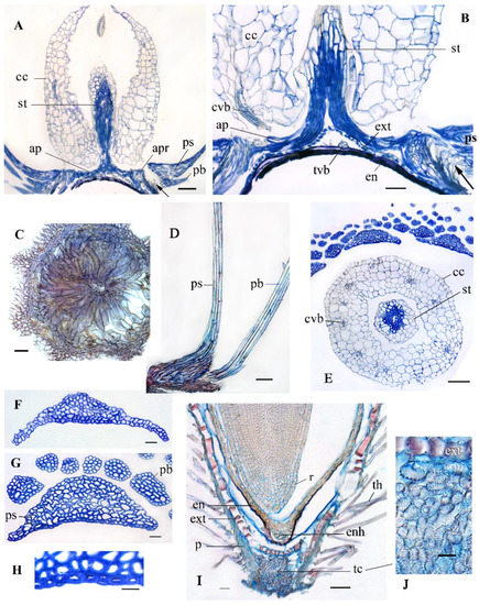 Anatomical structure of aerial achene in G. micrantha, light microscopy. (A,B) Longitudinal section (LS) of apical achene region at various magnifications. (C) Apical plate in transverse section (TS). (D) LS, pappus scale and bristle. (E) TS, corolla cupula and pappus base. (F) TS, the middle of pappus scale. (G) TS, the base of pappus scale and bristles. (H) TS, the adaxial side of pappus scale. (I) LS, basal achene region. (J) LS, tracheid-like cells in fruit stipe. Abbreviations: ap, apical plate; apr, apical pericarpal rim; cc, corolla cupula; cvb; corolla vascular bundle; en, endosperm; enh, micropylar endosperm haustorium; ext exotesta; p, pericarp; pb, pappus bristle; ps, pappus scale; r, radicle; st, style; tc, tracheid-like cells; th, twin hair; tvb, testa vascular bundle. Scale bars: 100 µm for (A,E), 50 µm for (B–D,I), 20 µm for (F,G), 10 µm for (H,J).