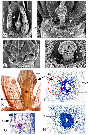 Apical region of aerial achene in G. micrantha, SEM (A–D) and light microscopy (E–H) images. (A) Dissected corolla cupula with a persistent style inside. (B) Apical plate and bottom part of the style; corolla, nectary and partly pappus deleted. (C) Surface of bulbous swelling of style. (D) Transverse section (TS) through the middle of corolla cupula and thickened style portion. (E) Fragment of longitudinal section (LS) through apical achene region. (F) TS, style thickened part. (G) LS, idioblast in the corolla axis. (H) TS, style base with nectary. Abbreviations: ap, apical plate; b, bulbous style swelling; cc, corolla cupula; cvb, corolla vascular bundle; n, nectary; pc, parenchyma cell; pz, pappus insertion zone; st, style; stvb, style vascular bundle; th, twin hair; ✱ large parenchyma cells. Scale bars: 200 µm for (A), 100 µm for (B,D), 50 µm for (C,E,H), 20 µm for (F), 10 µm for (G).