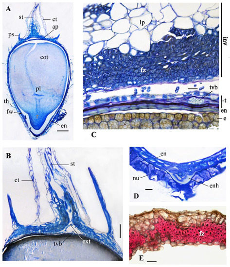 For anatomical study, fruits were first softened in a mixture of water, 96% ethanol and glycerol in equal proportions. Material was either used fresh or fixed in 70% alcohol and, for semi-thin sections, in 3% glutaraldehyde and 2% Osmium tetroxide. The longitudinal and transverse sections of fresh material 12 and 24 µm thick were made in the middle part of fruits using freezing microtome, and histochemical studies were carried out to determine lignin (with phloroglucinol and sulphuric acid) and cutin (with Sudan III). Paraffin sections (12 µm thick, stained with Safranin in combination with alcian blue) were made on a rotary microtome following standard procedures [40], and semi-thin sections (2–3 µm thick, stained with toluidine blue) of material embedded in Epon-Araldite epoxy resin were prepared on a Reichert Ultracut R ultramicrotome. Observations were made, and photomicrographs were taken using light microscope AxioImager A1 (Carl Zeiss) equipped with digital imaging AxioCam MRc5 and software Zen 2011. The paper follows the terminology of several authors [11,41,42,43,44,45].