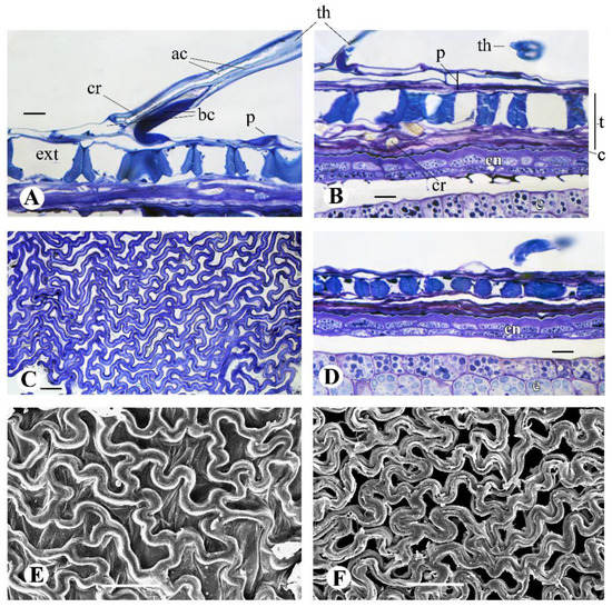 Fruit wall structure in G. micrantha, light (A–D) and scanning electron (E,F) microscopy. (A,B) Longitudinal sections (LS) of the achene wall in the basal region of aerial achene (A) and subterranean achene I (B). (C) Exotesta in the middle of subterranean achene I in surface view (SW). (D) LS, the middle of subterranean achene I. (E,F) SW, SEM micrographs of exotesta in subterranean achenes: (E) achene I, (F) probably subterranean achene II. Abbreviations: ac, apical cells of twin hair; bc, basal cells of twin hair; c, cuticle; cr, Ca oxalate crystal; e, embryo; en, endosperm; ext, exotesta; p, pericarp; t, testa (=seed coat); th, twin hair. Scale bars: 50 µm for (C,E,F); 10 µm for (A,B,D).