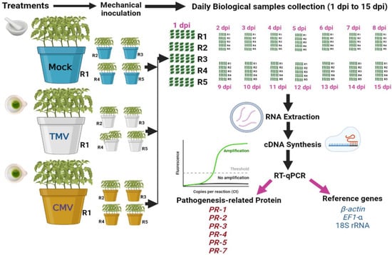The tomato seeds were sterilized in a controlled environment and then grown in sterile vermiculite pots. After 28 days of growth, the seedlings were moved to other pots. Each pot (20 cm) contained 3 kg of autoclave-sterilized sand and clay (1:1). After a week, each plant’s top two true leaves were mechanically inoculated with 0.5 mL of 20 µg/mL freshly prepared TMV or CMV []. The experiment was carried out over three treatments (Figure 1). The first treatment (mock) was the control treatment, in which tomato plants were inoculated with viral inoculation buffer. The second treatment was tomato plants inoculated with TMV. The third treatment was tomato plants inoculated with CMV. Each treatment consisted of five pots (five biological replicates), and each pot contained five tomato plants. All the plants were kept in the greenhouse at a temperature of 28/16 °C day and night with a relative humidity of 65%. The CMV and TMV symptoms were observed on each day. The tomato leaves (not mechanically inoculated) were collected daily from 0 to 15 dpi and then subjected to further analyses (ELISA and RNA extraction). The independent biological replicate of each treatment was a pool of 15 tomato leaves that were collected from five plants, with three leaves per plant, grown in each pot. Each biological replicate was tested in three independent technical replicates for reliability.
