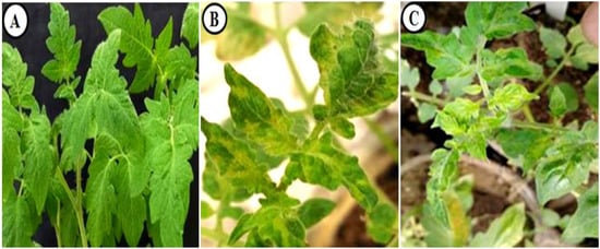 Under greenhouse conditions, both TMV- and CMV-infected tomato plants displayed multiple morphological changes. Similar to previous reports [,], the development of systemic mosaic with chlorosis symptoms on TMV tomato leaves was reported at 11 dpi. On the other hand, early CMV symptoms were noticed at 13 dpi. At 14 dpi, all the TMV-inoculated plants showed severe TMV-like symptoms such as mosaic, leaf deformation, and thickness on some tomato leaves (Figure 2B). On the other hand, at 16 dpi, all of the plants that had been infected with CMV showed severe symptoms such as mottling, mosaic, yellowing, and flecks of dead tissue (Figure 2C). The viral infections had a significant effect on leaf morphogenesis, which changed the shape of the leaves and slowed the growth of the whole plant [,]. An I-ELISA assay (Table 2) revealed that the first detection of viral infections was at 6 dpi for both TMV and CMV infection. Then, there was a dramatic increase in the accumulation levels, reaching a maximum of 15 dpi. No virus was detected in the mock-inoculated samples. The obtained results support previous studies, which showed that a viral infection might be detected in the early stages of an infected potato plant or other differential hosts [,].