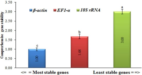 Comprehensive gene expression stability levels of three housekeeping genes (β-actin, EF-1α, and 18S rRNA) in healthy, TMV-, and CMV-infected leaf tissue samples of tomato plants. Statistically, there is no significant change between the means of the columns that start with the same letter.