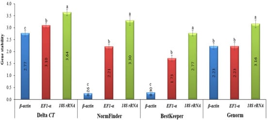 The four different methods used to evaluate the gene expression stability levels of housekeeping genes in healthy, TMV-, and CMV-infected tomato plants. The Delta CT method, NormFinder, and BestKeeper (as is harbored by β-actin) indicates more stable gene expression. Average gene stability values (M value) across all treatment groups using GeNorm revealed more stable β-actin and EF-1α genes. The values in the columns represent the means of five independent biological samples, while the error bars show the standard deviation (SD). According to Tukey’s HSD test (p ≤ 0.05), the values in the columns labeled with the same letter (a, b, and c) do not differ statistically.