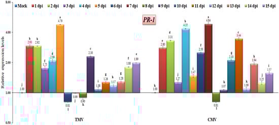 Comparison between the relative transcriptional levels of the tomato PR-1 gene in TMV- and CMV-infected tissues compared to control at 1 to 15 dpi. The columns show the mean value from five biological replicates, and the bars represent the standard deviation (SD). Means were distinguished using Tukey’s HSD test at p ≤ 0.05 levels, and small letters are used to represent differences. Columns of data showing different letters are significant.
