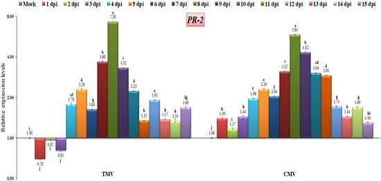 Comparison between the relative transcriptional levels of the tomato PR-2 gene in TMV- and CMV-infected tissues compared to control at 1 to 15 dpi. The columns show the mean value from five biological replicates, and the bars represent the standard deviation (SD). Means were distinguished using Tukey’s HSD test at p ≤ 0.05 levels, and small letters are used to represent differences. Columns of data showing different letters are significant.