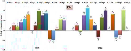 Comparison between the relative transcriptional levels of the tomato PR-3 gene in TMV- and CMV-infected tissues compared to control at 1 to 15 dpi. The columns show the mean value from five biological replicates, and the bars represent the standard deviation (SD). Means were distinguished using Tukey’s HSD test at p ≤ 0.05 levels, and small letters are used to represent differences. Columns of data showing different letters are significant.