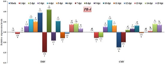 Comparison between the relative transcriptional levels of the tomato PR-4 gene in TMV- and CMV-infected tissues compared to control at 1 to 15 dpi. The columns show the mean value from five biological replicates, and the bars represent the standard deviation (SD). Means were distinguished using Tukey’s HSD test at p ≤ 0.05 levels, and small letters are used to represent differences. Columns of data showing different letters are significant.